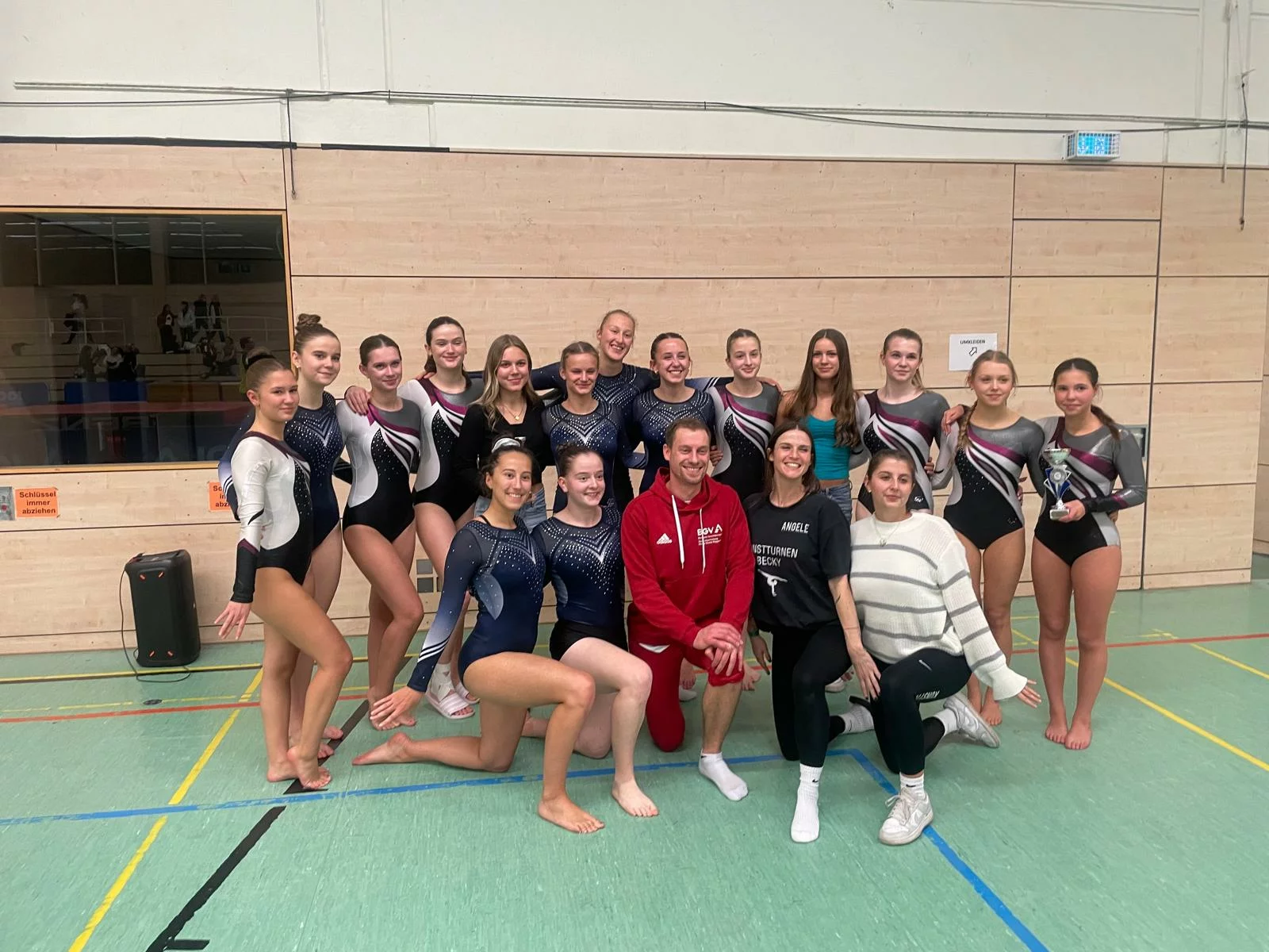 Am Sprung zeigten gleich 3 Turnerinnen ihren neu erlernten Tsukahara (Randwende über den Sprungtisch mit Salto rückwärts). Leider schaffte es keine der Drei ihren schwierigen Sprung in den Stand zu turnen, wodurch direkt zu Beginn einige Abzüge in Kauf genommen werden mussten. Am folgenden Barren und Boden lief es hingegen super und man konnte gegen den führenden TV Muggensturm 1 aufholen. Beim abschließenden Balken konnten alle Mädels ihre neu erlernten Teile stehen (Salto rückwärts, Salto seitwärts, Flick-Flack gespreizt), jedoch musste auch hier der ein oder andere Absteiger in Kauf genommen werden. Am Ende Stand ein 2. Platz, vor Haueneberstein, Hügelsheim und Muggensturm 2. Lediglich Muggensturm 1 musste man mit knappen 0,25 Pkt. vorbei ziehen lassen. Für das Ligafinale am 15.11. in Sinzheim ist also noch alles offen.