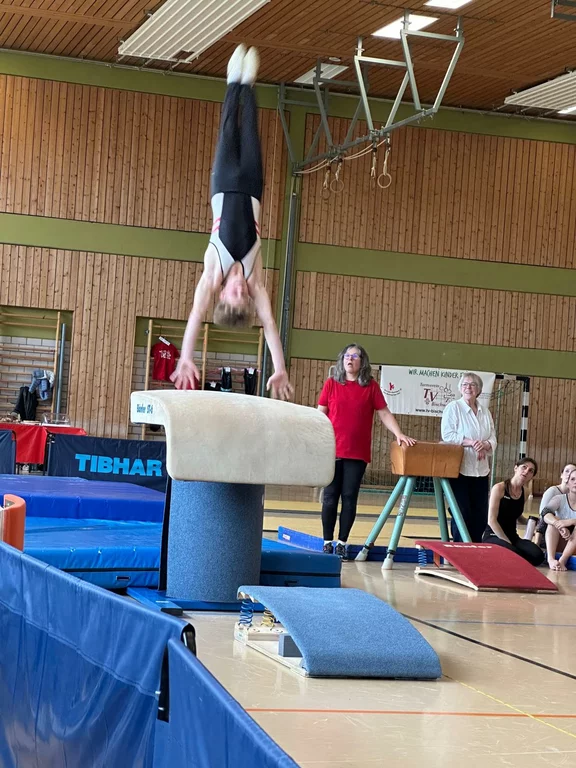In der Gauklasse 14/15 starteten Emma Burkhard, Jana Wetzel, Melina Kolb, Pauline Weinfurtner und Samira Markwordt. In einem großen Teilnehmerfeld von zwölf Mannschaften verfehlten die Turnerinnen nur knapp das Treppchen und belegten einen starken 4. Platz.